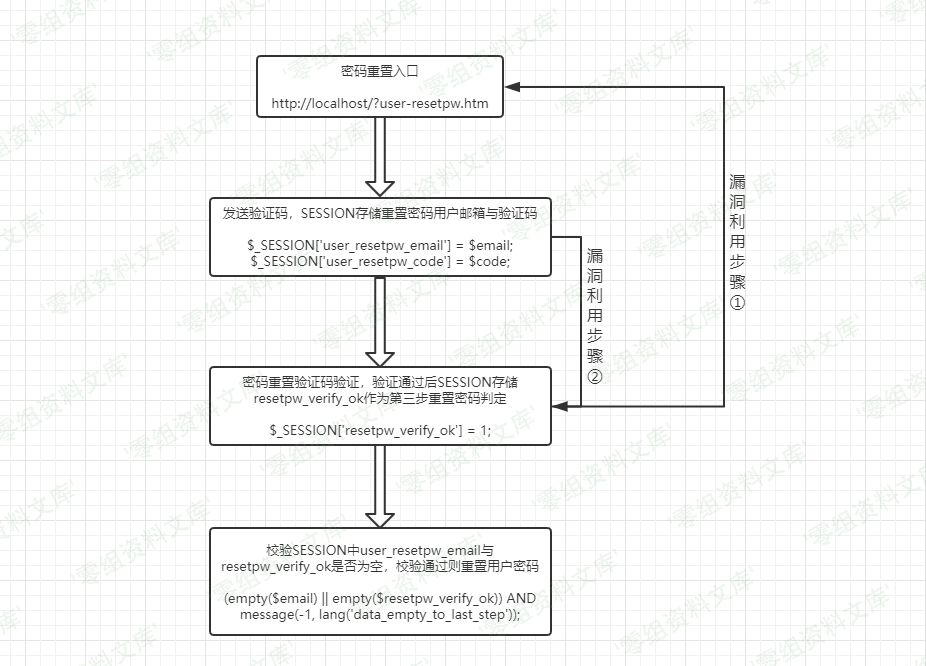 梳理密码重置逻辑流程图如下(黑色实现箭头为漏洞利用的简单思路步骤):