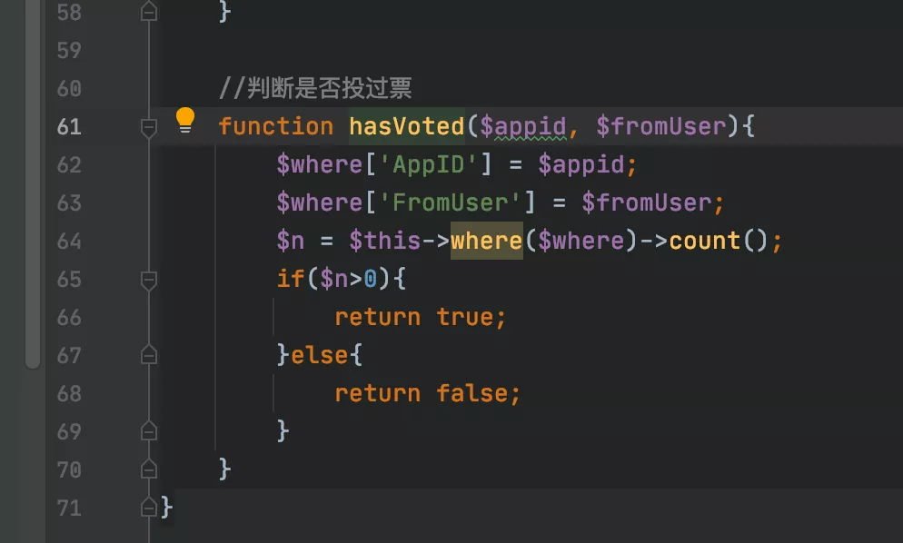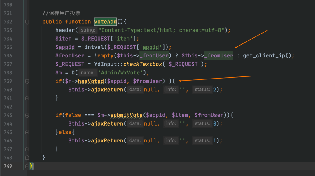 这里将`$this->_fromUser`带入到了`hasVoted`函数中,跟进该函数: