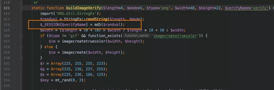 这个函数挺有意思的,本来是个生成验证码的操作,但是没想到所有的参数都是用户可以控制的,特别是这个`$verifyName`还可控。跟进`buildImageVerify`看看如何设置的`session`。