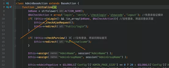 然后我们去看看管理员的校验函数。在`App/Lib/Action/AdminBaseAction.class.php:7`