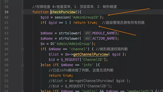 起作用的就两个函数,`isLogin`和`checkPurview`。跟进第一个看看: