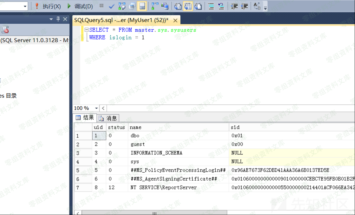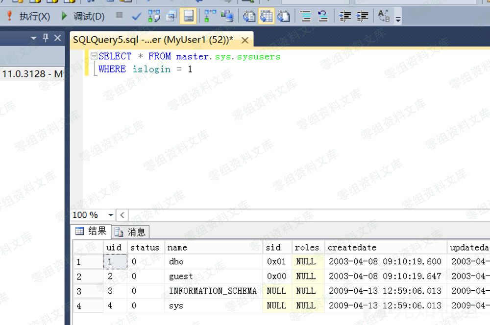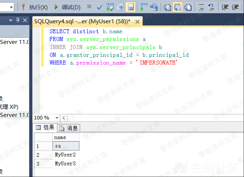 默认情况下,系统管理员可以模拟任何人,但是正常登录必须分配权限来模拟特定的用户,使用MyUser1用户登录,打开新建查询,执行下面语句查询那些用户可以用来模拟登录