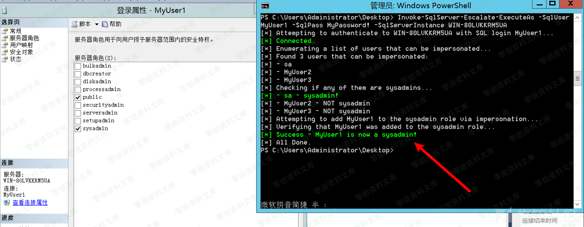 Write-Host “[*] Verifying that $UsertoElevate was added to the sysadmin role…”
