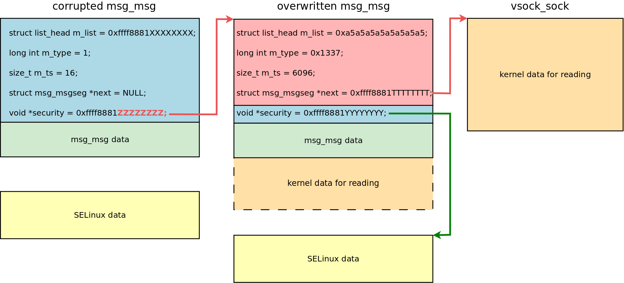 前面是消息頭,後面是消息數據。如果用戶空間中的struct msgbuf有一個16字節的mtext,則會在kmalloc-64塊緩存中創建相應的msg_msg。 4字節的write-after-free會破壞偏移量40的void *security指針。 msg_msg.security字段指向由lsm_msg_msg_alloc()分配的內核數據,當收到 msg_msg時,就會被security_msg_msg_free()釋放。因此,破壞security指針的前半部分,就能獲得 arbitrary free。