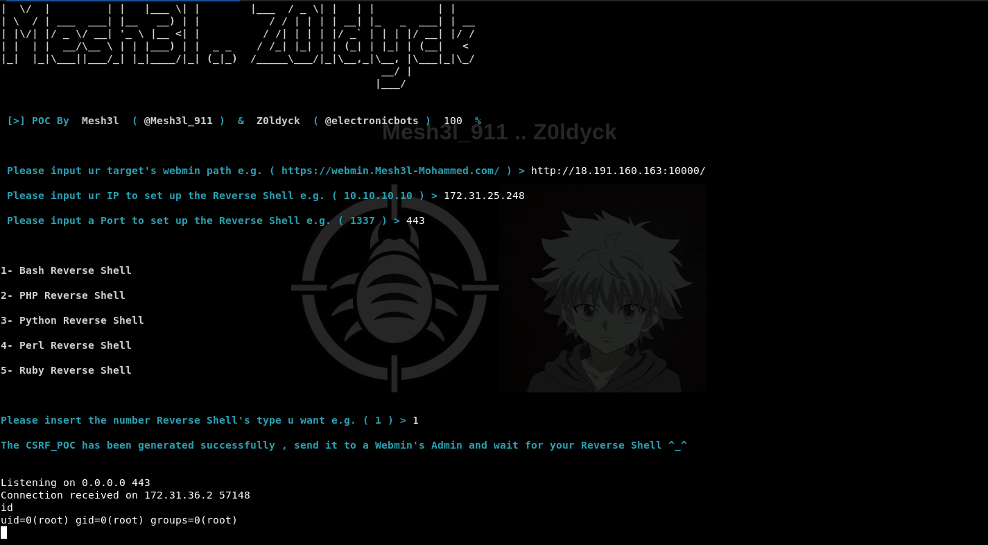 "\033[1;36m\nThe CSRF_POC has been generated successfully , send it to a Webmin's Admin and wait for your Reverse Shell ^_^ \n \033[1;m")