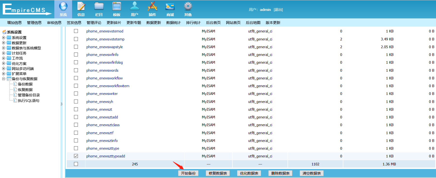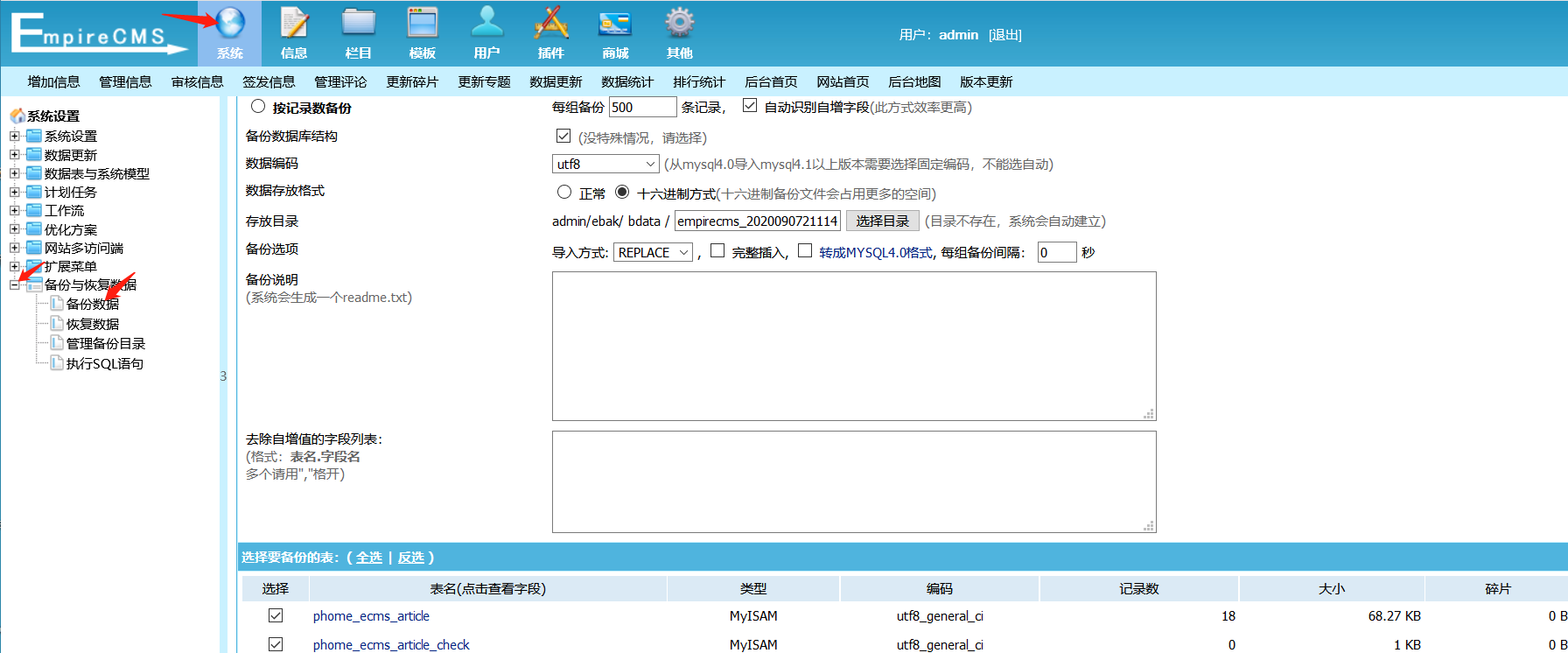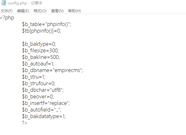 需要有后台权限。 1.登入后台管理页面 2.点击系统->备份->备份数据  3.随便选择一个表,点击最下面的开始备份,抓包  4.抓包后修改tablename字段为命令执行语句  5.返回页面  6.访问备份路径下config.php亦可  7.查看config.php,命令已经写进去了