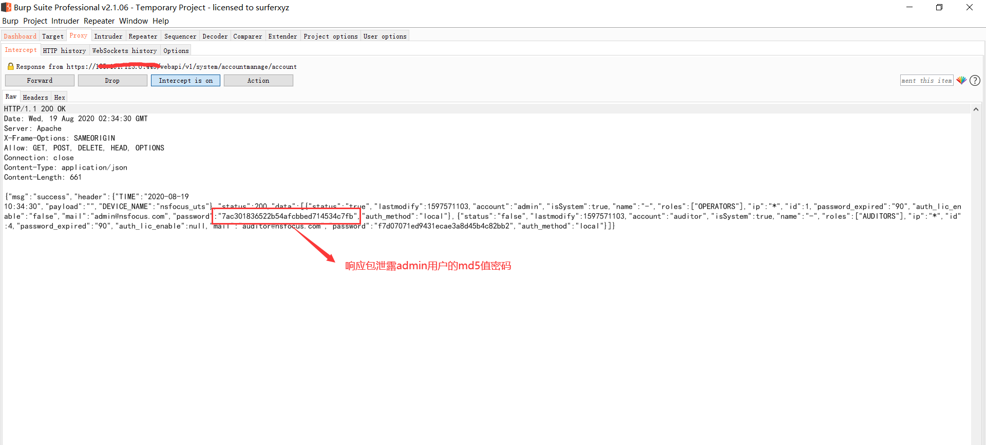 **漏洞详情:** 绿盟全流量威胁分析解决方案针对原始流量进行采集和监控,对流量信息进行深度还原、存储、查询和分析,可以及时掌握重要信息系统相关网络安全威胁风险,及时检测漏洞、病毒木马、网络攻击情况,及时发现网络安全事件线索,及时通报预警重大网络安全威胁,调查、防范和打击网络攻击等恶意行为,保障重要信息系统的网络安全。 绿盟综合威胁探针设备版本V2.0R00F02SP02及之前存在此漏洞。 **处置意见:** 建议尽快更新补丁至最新: http://update.nsfocus.com/update/listBsaUtsDetail/v/F02 **漏洞利用过程:**   对响应包进行修改,将false更改为true的时候可以泄露管理用户的md5值密码    利用渠道的md5值去登录页面   7ac301836522b54afcbbed714534c7fb  成功登录,登录后通过管理员权限对设备进行管控,并且可以看到大量的攻击信息,泄露内部网络地址包括资产管理。
