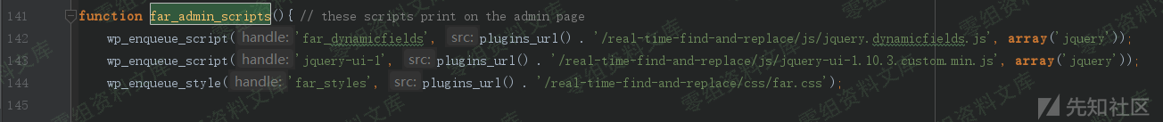 ‘far\_admin\_scripts’);在admin\_print\_scripts-tools\_page\_real-time-find-and-replace页面中加载far\_admin\_scripts函数,而far\_admin\_scripts函数中指定了要引入的js与css文件,见下图