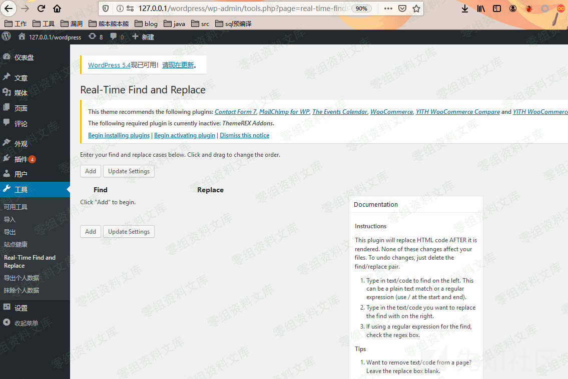 在弄清楚插件是如何注册后,通过访问工具菜单栏中的real-time-find-and-replace子菜单,即可进入存在漏洞的页面,该页面即为far\_options\_page函数加载far\_admin\_scripts函数中引入的js与css文件后所渲染的结果