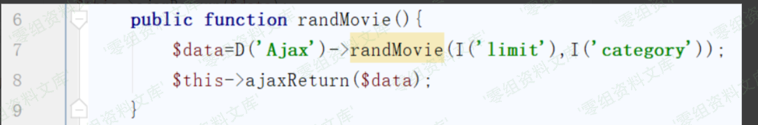 第七行代码中调用了`Ajax`模型中的`randMovie`方法,同时`limit`和`category`是我们输入的可控的参数,跟进`randMovie`方法