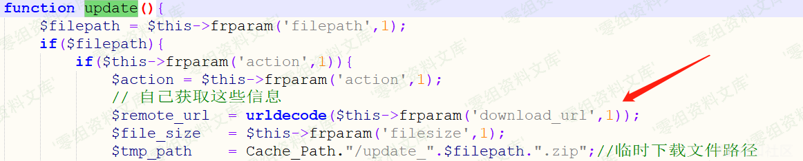 攻击者可以控制download\_url传入参数的值,从而传入被压缩的可执行脚本,然后该压缩包会被解压并传入到特定位置,实现getshell所以只需要攻击者在自己控制的网站上压缩可执行脚本然后将url赋值给download\_url即可实现任意文件上传定位下函数位置,该函数位于/A/c/PluginsController.php下的update函数传进来的值通过frparam函数处理之后变赋值给了remote\_url跟进到frparam函数函数中,该函数位于/FrPHP/lib/Controller.php中