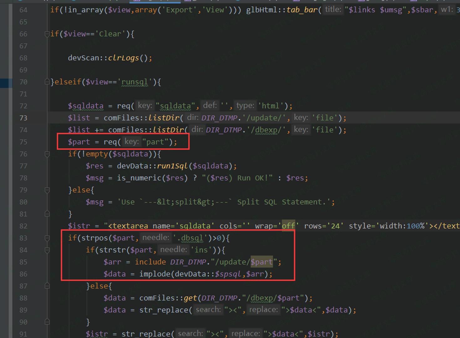 找到相应的sql shell功能对应的代码,存在问题的参数是`$part`,从代码中可以看到`$part`参数直接传入到include进行文件包含的,虽有两个if判断,但是这很容易就可进行绕过了进入文件包含语句中,所以只要跟踪的`$part`参数的传入即可。