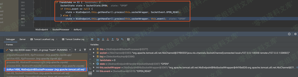 由于 AJP 并不是一个 HTTP 业务流,走的是 Socket ,所以 tomcat 前面接收业务流的时候调用的是一个 Socket 解析类 SocketProcessorBase#dorun 来处理 ajp 传入的二进制流。