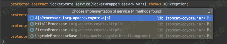 这里需要感谢 tomcat 优雅的代码风格,可读性真强,和 socket 相关的 service 就下图里面的这些,所以AJP的业务流自然就落在了org/apache/coyote/ajp/AjpProcessor#service这个方法上面进行处理。