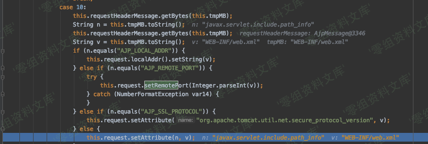 跟进 prepareRequest 方法,这个方法会进行一个 while 为 true 的无限循环,根据attributeCode的结果进行选择,命中 case 10 核心中有个request.setAttribute(n, v)方法,这个方法会从我们之前设置方法中取值,设置,遍历循环POC中的javax.servlet.include.request_uri,javax.servlet.include.path_info,javax.servlet.include.servlet_path这三个属性对应的值,并且通过PUT方法进行赋值。