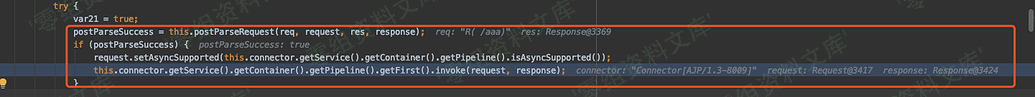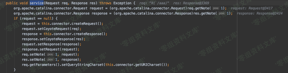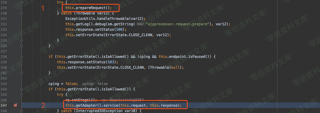 好了,这里知道了在 prepareRequest 方法中核心是将三个值动态赋予我们想要的结果,再回到org/apache/coyote/ajp/AjpProcessor#service中,在经过 prepareRequest 方法处理之后来到的就是getAdapter().service(this.request, this.response);,这个 serivce 就是后续处理 request 对象和 response 对象了。
