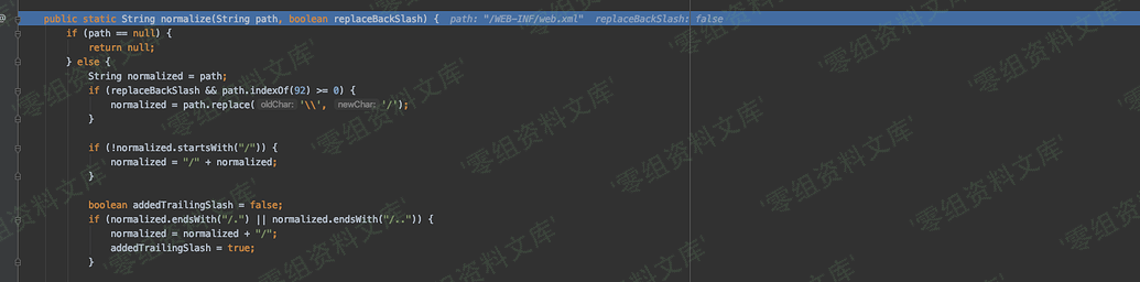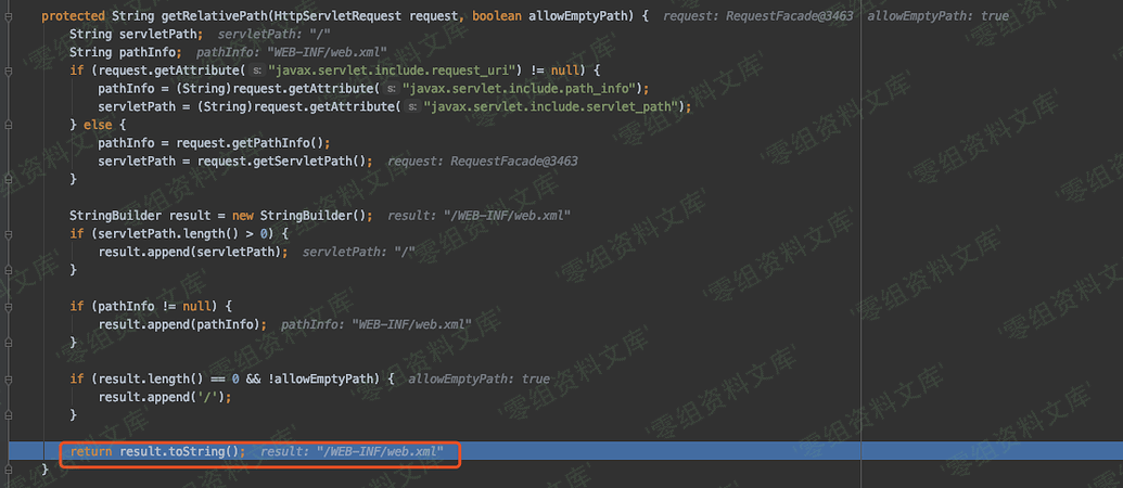 跟进 getRelativePath ,一眼就知道为什么要设置 request_uri 、path_info 、servlet_path 这三个属性了,通过路径的拼接,最后返回的 servletPath 为/,容器内部为 /WEB-INF/web.xml 的文件内容。