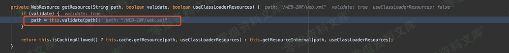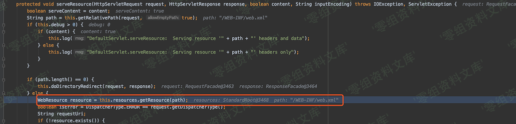 继续回到 serveResource 方法中 getResource 根据前面的 path 也就是 /WEB-INF/web.xml 进行资源获取。而这里是没办法../出去的,原因继续往下看。