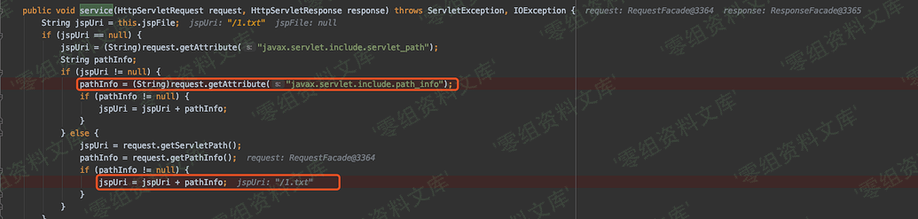 org/apache/jasper/servlet/JspServlet#service负责处理xxx.jsp访问逻辑,跟进来 jspUri 是通过 servlet_path 和 path_info 拼接而来的。