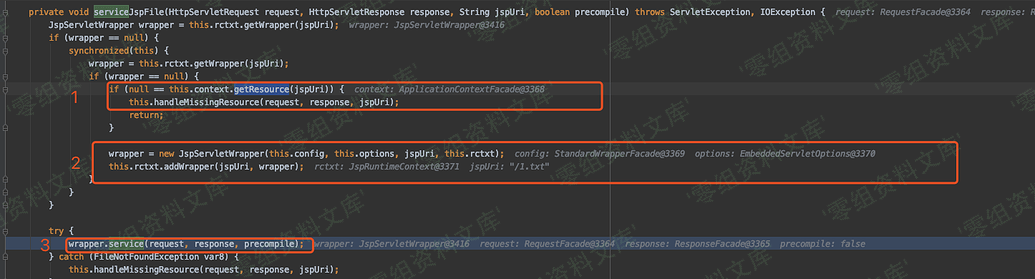跟进 serviceJspFile 方法,首先先通过 getResource 获取上传文件的内容,然后再通过初始化 wrapper 对象传入相关参数,然后再调用 JspServletWrapper#service 进行解析。
