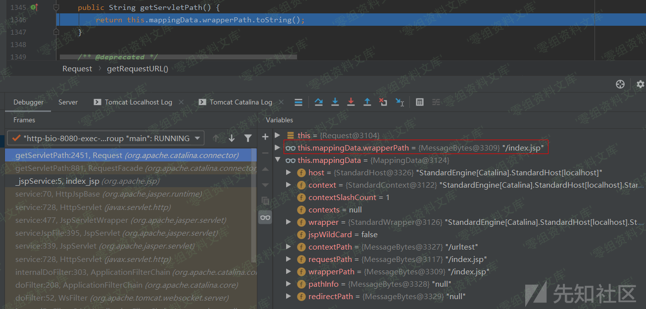 跟进去,看到是直接返回前面Tomcat已经处理过后的提取处理的Servlet路径,注意这里是获取MappingData类对象中的wrapperPath属性值: