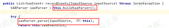 如上图所示,在调用 recordEvents 的时候带入了输入流,这个输入流是我们可控的,即在自己服务器上放置的 xml 文件, xml 解析的过程就是发生在 recordEvents 的执行过程中,而后红框的调用,是对已经解析完成的内容进行一定的逻辑操作,然后重载配置,后面的过程就不分析了,简单的去看一下 recordEvents 执行过程,如下