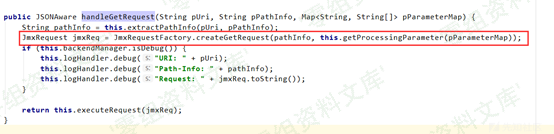 只要是 /jolokia 为第一个 path 节点的,都会进入它的执行逻辑中,可以一直跟进到org.jolokia.http.HttpRequestHandler#handleGetRequest 里