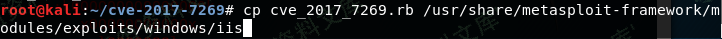 –然后我们需要复制EXP到msf框架中#注意复制时,是下划线”_”不要写成cve-2017-7269.rb#,在目录下重命名这个文件为cve_2017_7269.rb,输入: