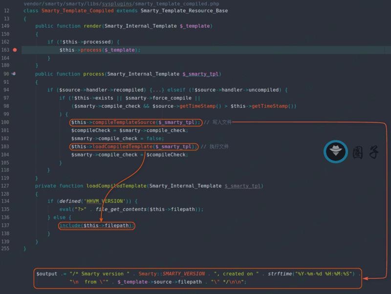 我们接着看第二个操作:写入 compile 文件并包含。首先,写入 compile 文件中的内容包含模板路径(即下图最后一行代码 $_template->source->filepath ),这个模板路径就是我们传入 display 方法的参数。虽然该参数被注释包裹,但是我们可以用 */ 闭合。写入 compile 文件,程序就开始包含该文件,最终导致代码执行(下图第137行)。
