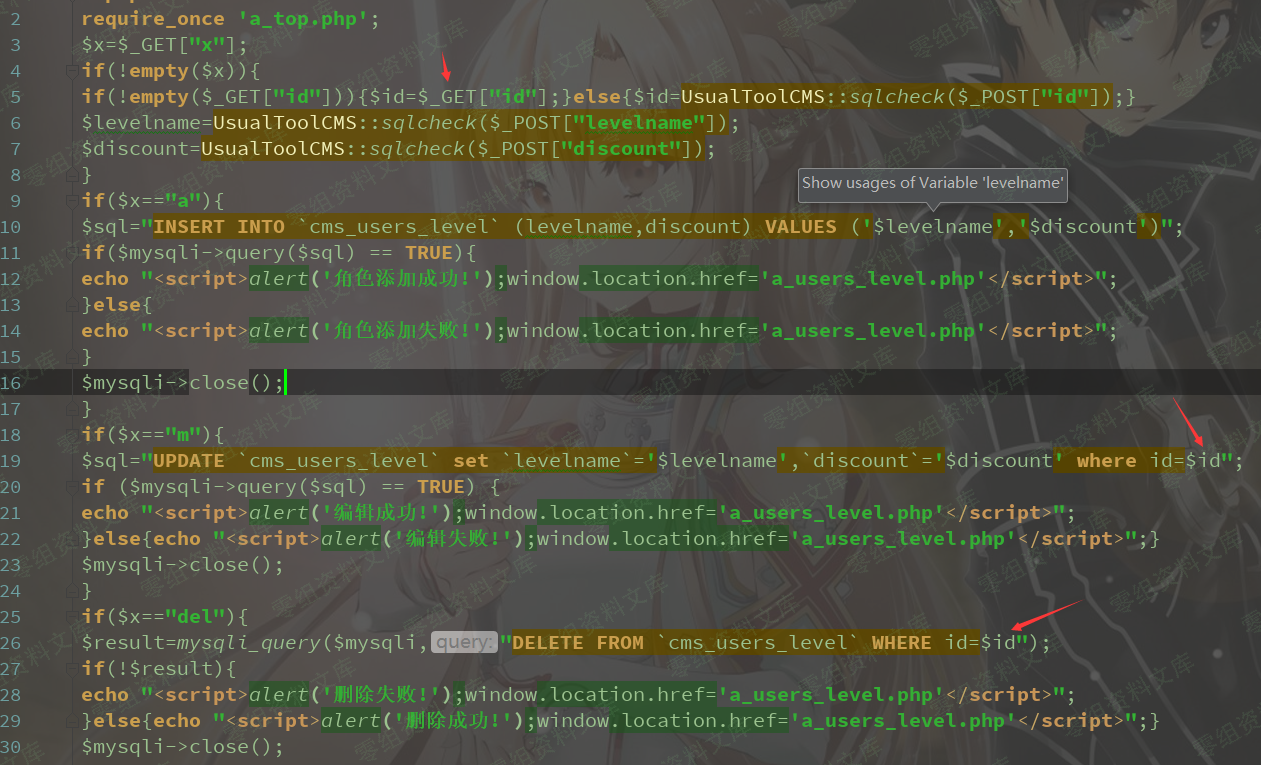 从get处获取id参数,id存在无任何过滤,当postt id时,通过sqlcheck函数进行过滤,来到文件./class/UsualToolCMS_INC.php第33行,将(‘,,”,null)转义,34行调用sqlchecks函数,比没过滤sql,然而a_users_level.php第19行id不是字符