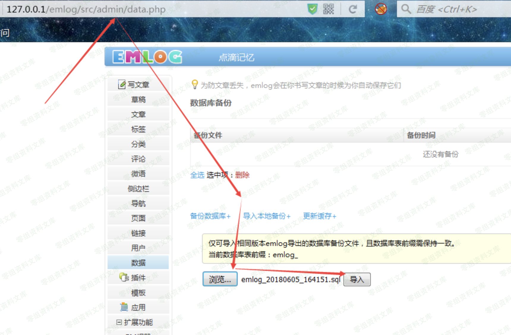 Emlog<=6.0 ### 三、复现过程 备份数据库到本地:  修改数据库文件,将备份的数据库文件进行修改,在最后一段添加上自己构造的SQL语句:  这一段sql语句主要功能是:首先判断是否存在emlog_shell数据表,如果存在则删除该表,之后创建一个新的emlog数据表,之后再向该表中添加信息(这里可以填入一句话木马),之后使用s`elect..... into outfile ....`将数据表中的表项内容读入到一个shell.php的PHP文件汇总,之后再删除该数据表! 导入数据库:  之后访问之:
