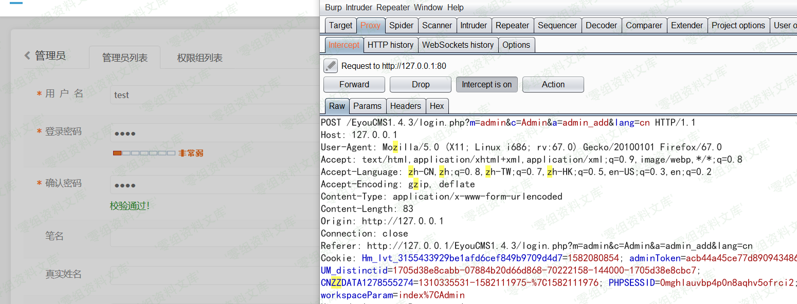 登陆后台,在高级选项>管理员>新增管理员点击之后截包