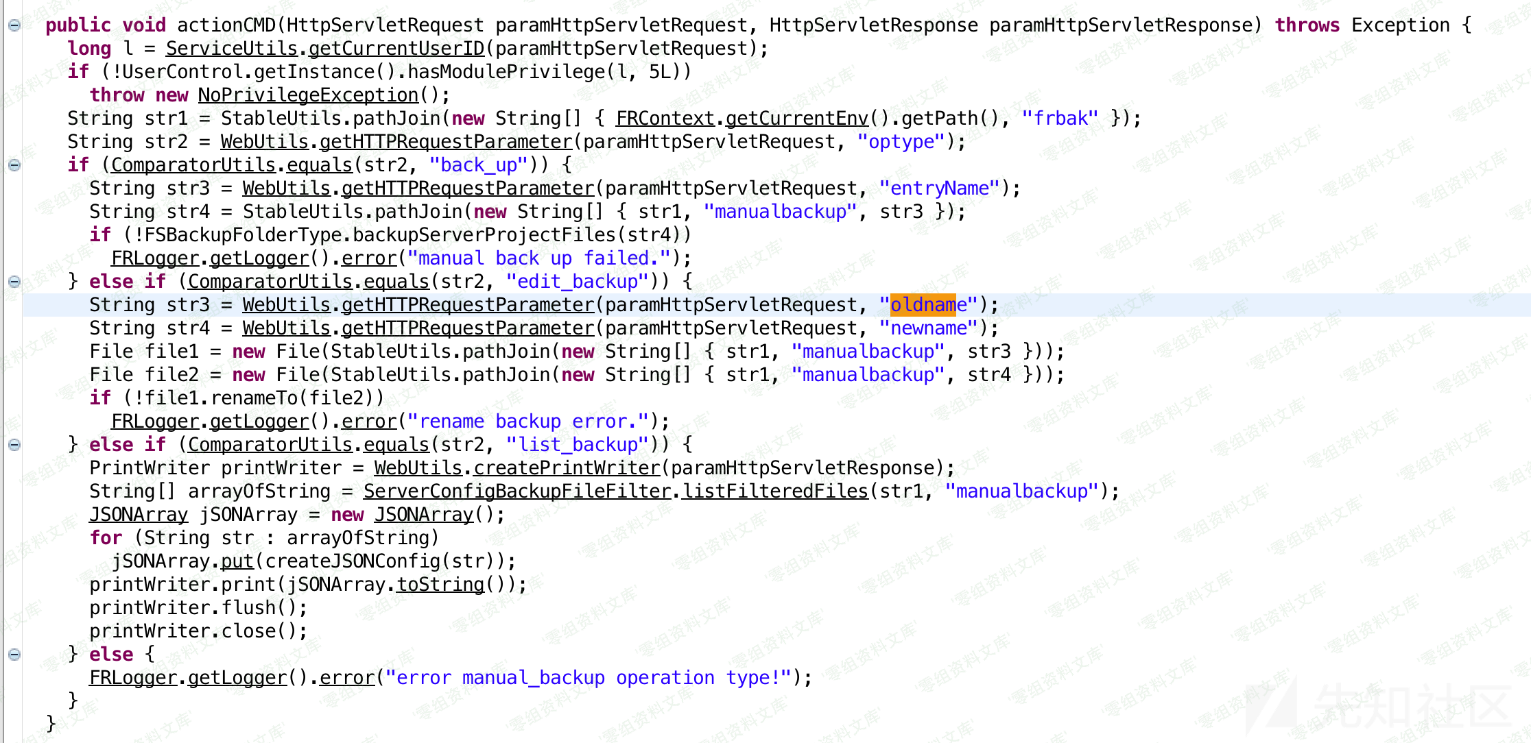 漏洞代码位于com.fr.fs.web.service.ServerConfigManualBackupAction中