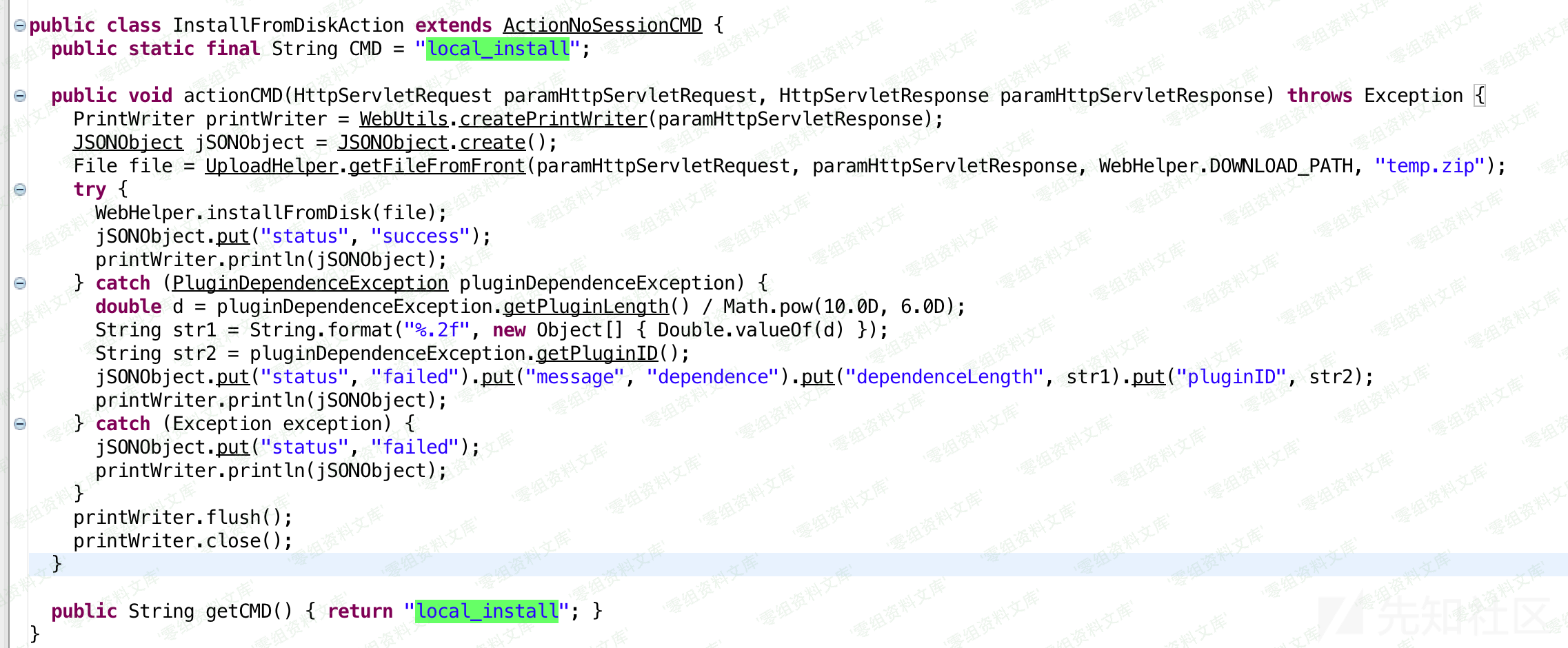 漏洞代码位于fr-platform-8.0.jar包中的com.fr.fs.plugin.op.web.action.InstallFromDiskAction