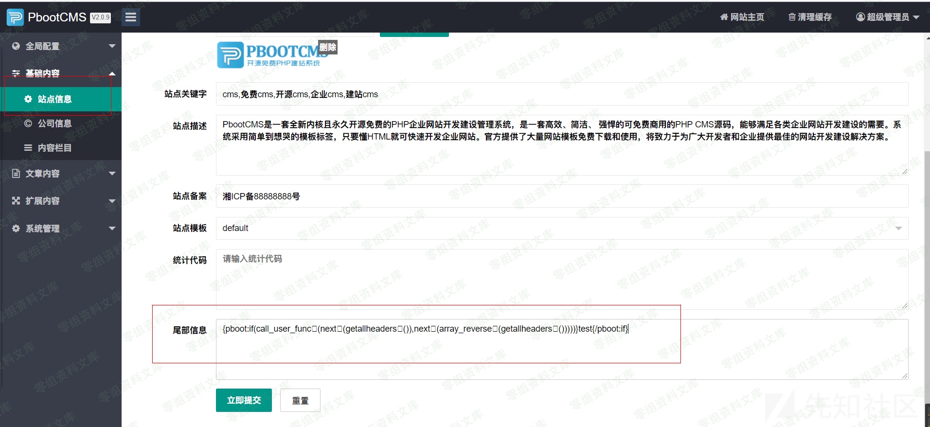 正常登录后台,在站点信息中插入如下代码并且保存