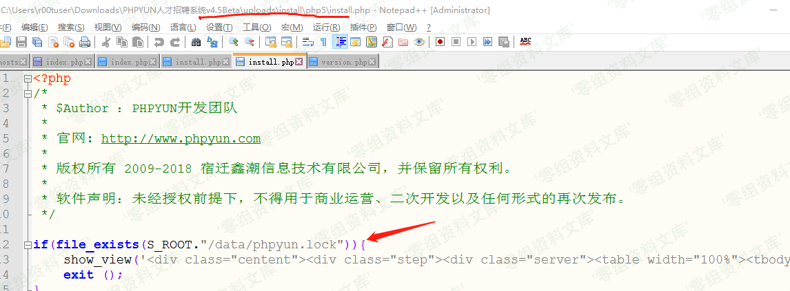 取得路径应该是 根目录/install/,按照上图的路径创造的lock文件应该是放至于 根目录/data/phpyun.lock。