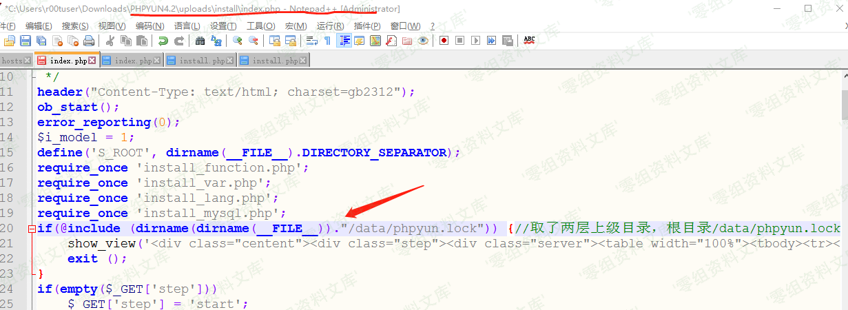 取得是当前文件的绝对路径。拼接起来,检测的lock文件位置应该是 根目录/install/data/phpyun.lock。