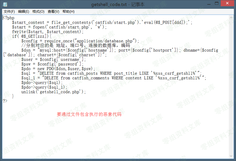 前台注册一个账户->注册一个图片马到网站中->评论处插入xss代码->等待无辜管理员登录网站->获取 verification(绕过检测)->管理员入口-页面管理-新建页面-csrf插入一条非法语句引起包含漏洞(用来包含前面的图片马)->包含漏洞执行代码->包含漏洞添加getshell_code.php文件写入恶意代码->包含漏洞-将框架文件start.php添加一句话木马-包含数据库配置文件-连接数据库->删除我们前面的评论->删除我们csrf创建的页面->邮件通知我们->getshell