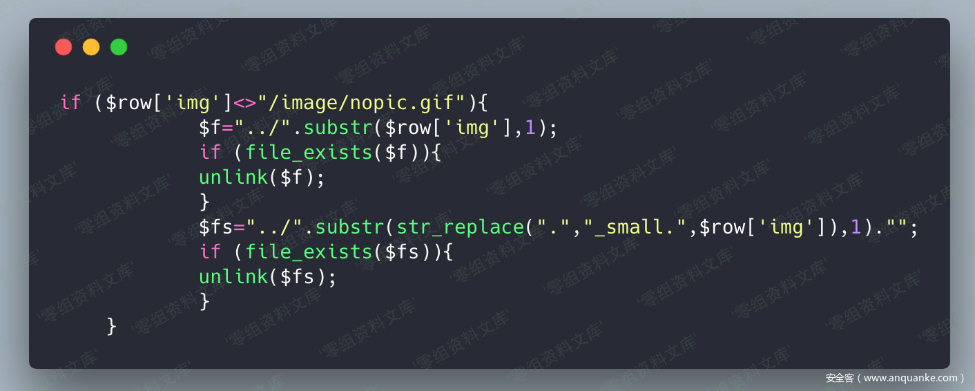 看到是从数据库中取出的img字段,然后直接判断了是不是默认值,然后检查文件存在,最后是删除,这其中并没有涉及到文件合法性检查。